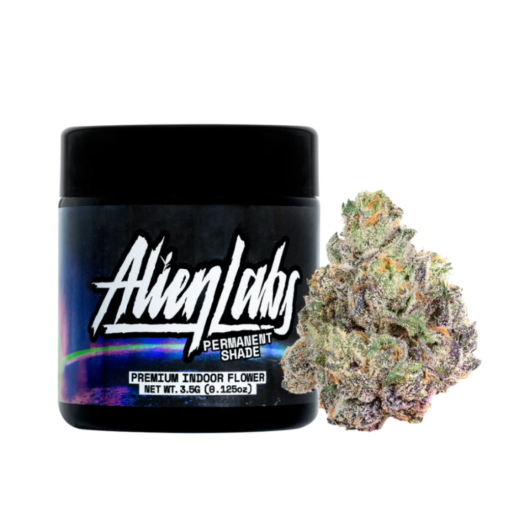 This jar contains 3.5 grams of the indoor grown strain Permanent Shade by Alien Labs. These buds feature a striking contrast of dark green and deep purple hues. Shaped like miniature trees, each flower is heavily drenched in shimmering trichomes, promising a potent and resinous experience. Alien Lab's indoor flower is for the cannabis connoisseur who has tried everything, knows what quality is, and wants to experience new, top-notch strains.