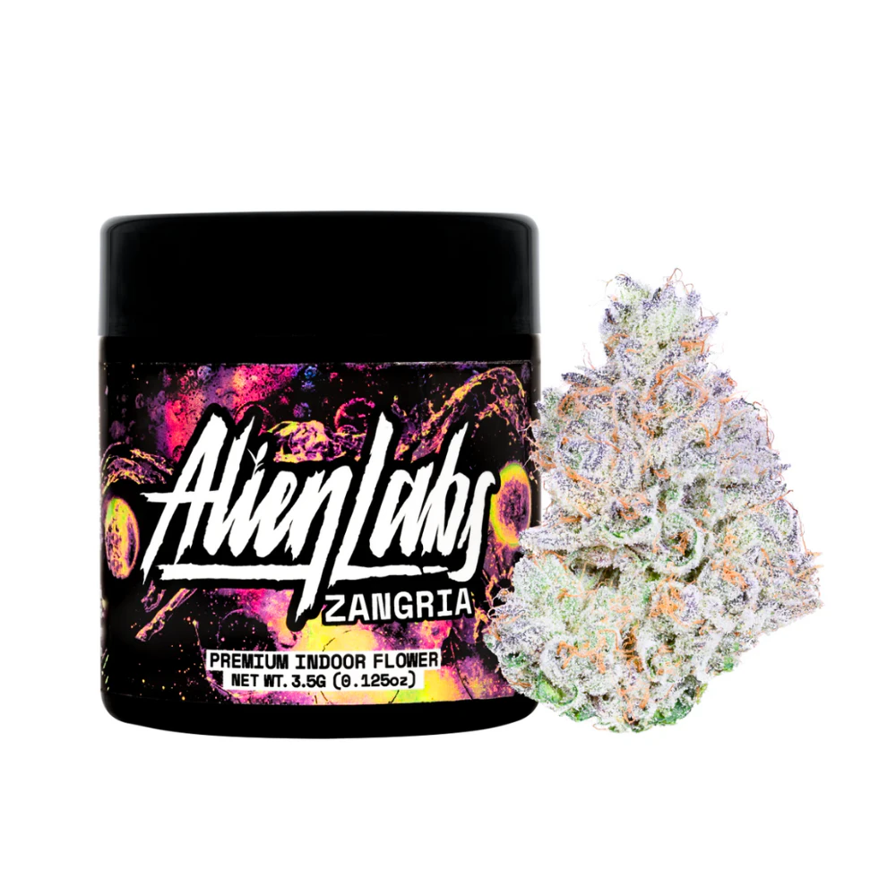 Embark on a cosmic journey with this 3.5g jar of Zangria, an indoor-grown strain by Alien Labs. Its surface glistens with crystalline trichomes, revealing vibrant purples and rich greens beneath. Their wide range of cannabis products are for the cannabis connoisseur who has tried everything, knows what quality is, and wants to experience new, top-notch strains.