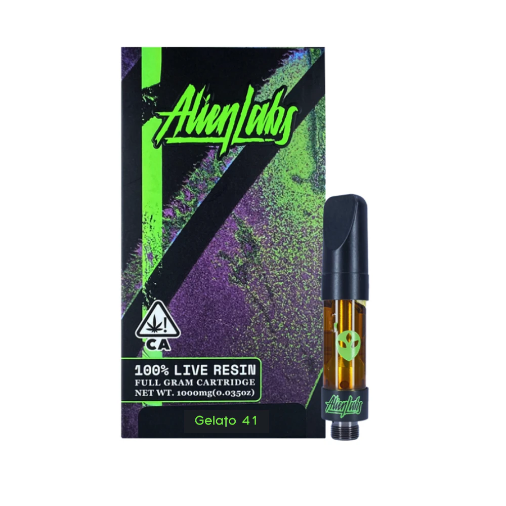 This Live Resin vape cartridge from Alien Labs contains 1 gram of the cannabis strain Gelato 41. The cartridge is compatible with 510-thread vape batteries. The Live Resin inside is made from freshly harvested and flash-frozen cannabis, producing a higher concentrated terpene experience with the true flavor and power of the living plant. Resulting in a world-class vape product with loud aromas, bold flavor, and strong effects that you expect from the Alien Labs brand. Store upright and at room temperature.