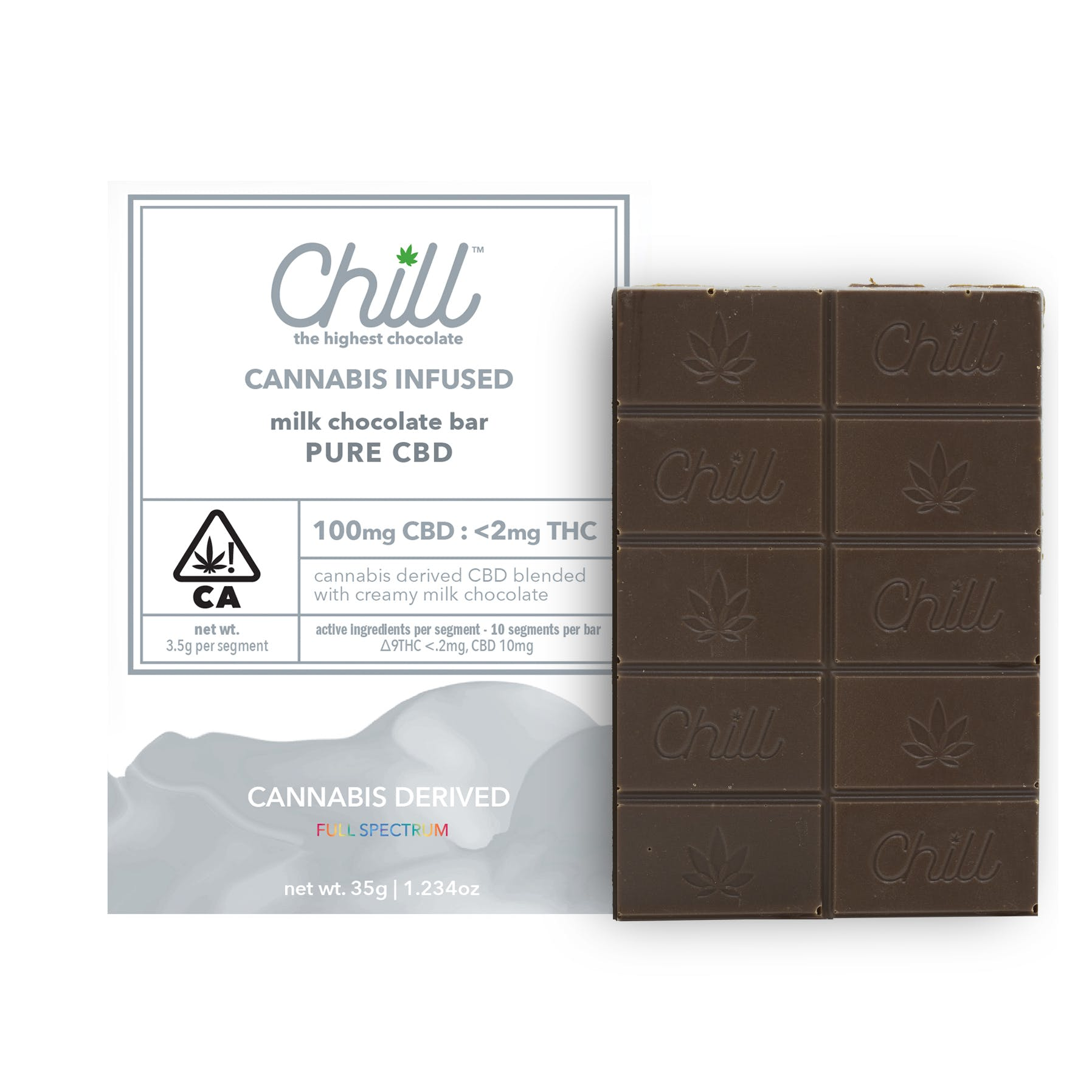 The highest experience in CBD chocolate! Cannabis derived CBD extract is blended with Chill's classic creamy milk chocolate to offer a relaxing, stress-relieving edible without the psychoactive pressure THC edibles may induce. 100mg CBD, < 2mg THC. Handmade with ethically sourced, high-quality ingredients, you'll be remiss to let CHILL's award-winning infused chocolates pass you by.