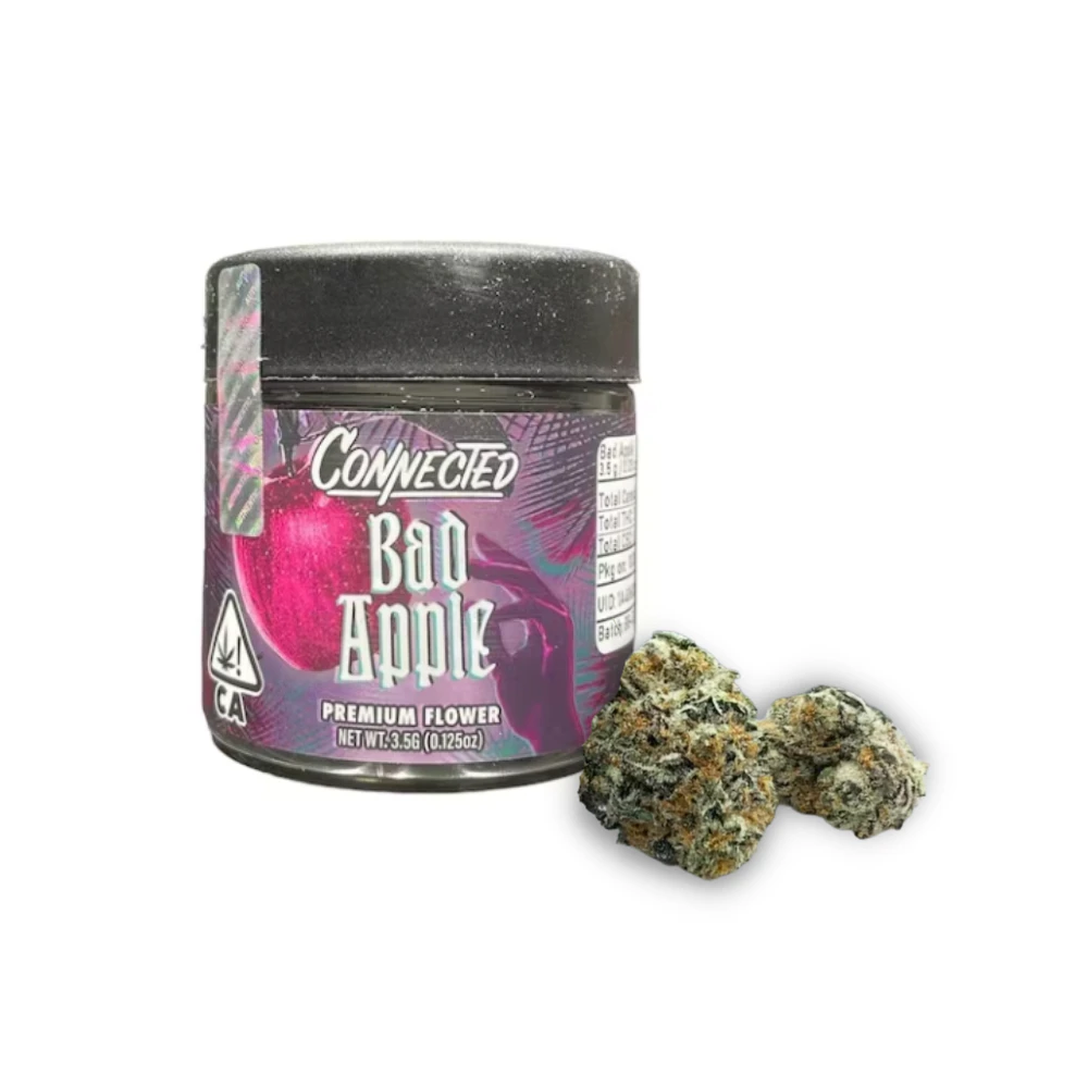 This cannabis jar contains 3.5 grams of the Hybrid strain Bad Apple from Connected farms. The fall festive strain with a crisp apple flavor is potent and might tingle your tastebuds. This strain, also known as "Sour Apple Diesel," has calming effects that could keep you slouched on the couch. After work or on a leisurely afternoon, Bad Apple is the perfect puff for winding down and enjoying the California sunset. This strain is preferred by medical marijuana users to treat the symptoms of stress and pain. With meticulous attention to detail and impeccable terpene profiles, Connected creates premium, top-quality designer strains that have intense and distinctive flavors, odors, and colors.