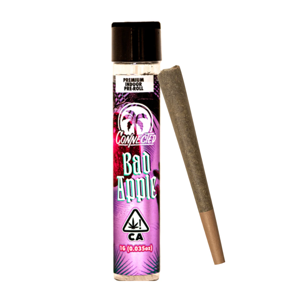 This 1g single pre-roll from Connected farms contains 1 gram of the cannabis strain Bad Apple. The fall festive strain with a crisp apple flavor is potent and might tingle your tastebuds. This strain, also known as "Sour Apple Diesel," has calming effects that could keep you slouched on the couch. After work or on a leisurely afternoon, Bad Apple is the perfect puff for winding down and enjoying the California sunset. This strain is preferred by medical marijuana users to treat the symptoms of stress and pain. With meticulous attention to detail and impeccable terpene profiles, Connected creates premium, top-quality designer strains that have intense and distinctive flavors, odors, and colors.