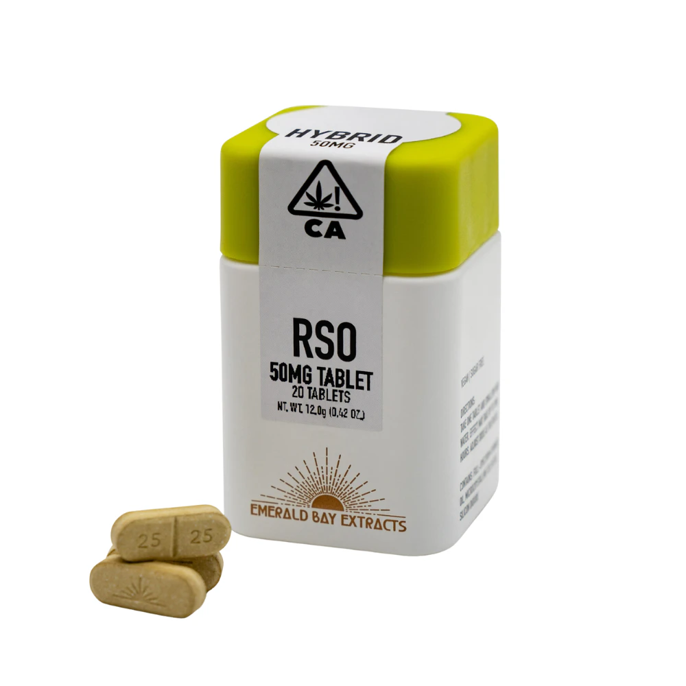Rick Simpson Oil (RSO) is a special type of full-spectrum extract. Emerald Bay Extracts Tablets consist solely of RSO and microcrystalline cellulose, the primary component of many tablets, mints, and candies, as well as silicon dioxide – a normal additive to pharmaceutical tablets and supplements to allow them to be pressed into a pill. Contains 20 tablets with 50mg of THC each, 1000mg per bottle.
