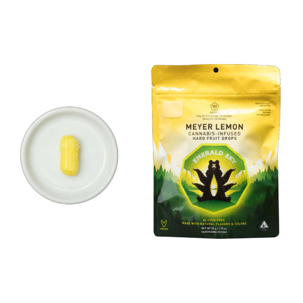 Emerald Sky Meyer Lemon Hard Fruit Drops are delicious, artisanally crafted hard candies, brightly flavored with the natural essence of Meyer lemons. Each 5 mg candy is accurately dosed with THC Sativa to provide a daytime high. All 20 candies in the bag are individually wrapped, making them super easy to take on the go. What a delightful way to start your day! 5mg THC per serving, 20 servings and 100mg THC total. Ingredients: Sugar, Corn Syrup, Citric Acid, Natural Meyer Lemon flavor, Gum Arabic, Turmeric, Cannabis Extract.