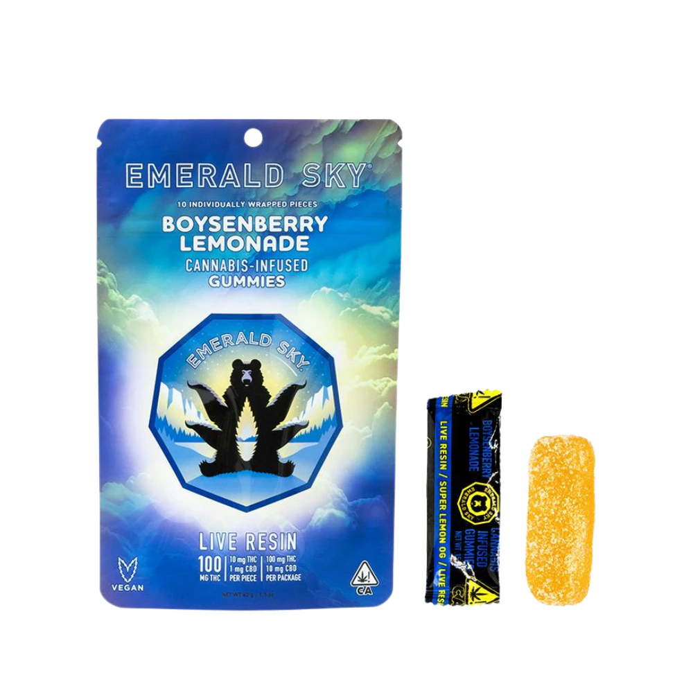 Emerald Sky has captured the essence of Super Lemon OG in this aromatic and sprightly live resin blend. These 100mg THC Boysenberry Lemonade Live Resin Gummies are expertly crafted for relaxing body effects and energetic uplift.10mg of THC per bite and 1mg CBD per bite for a total of 100mg THC per tin and 10mg CBD per bag. Melt Resistant up to 200 degrees.