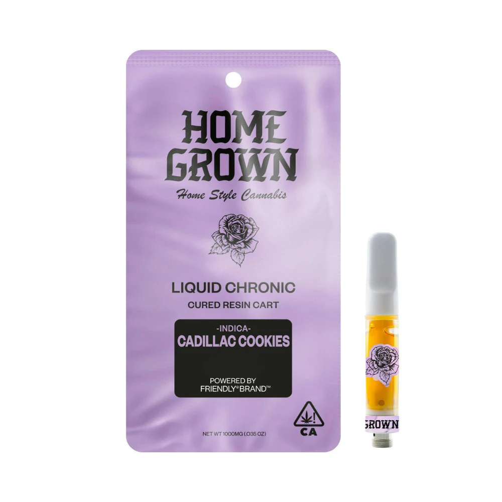 This Cured Resin vape cartridge from Homegrown x Friendly Farms contains 1 gram of the indica strain Cadillac Cookies. The cartridge is compatible with 510-thread vape batteries and should be stored upright and at room temperature. Home Grown, for locals only. Rooted in Community; Blooming with Attitude. They are on a mission to provide locals with west coast chronic.