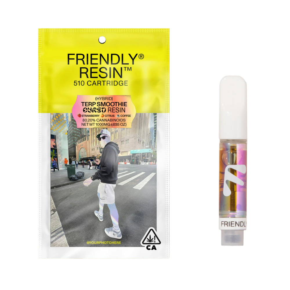 This Cured Resin vape cartridge from Friendly Farms contains 1 gram of the Hybrid strain Terp Smoothie. The cartridge is compatible with 510-thread vape batteries and should be stored upright at room temperatures. Friendly Farms cured resin cartridges are crafted from cured cannabis flower grown by industry-leading cultivators from California. They do not filter or use additives in their oil because they believe in the most natural representation of each strain’s unique flavors and effects.