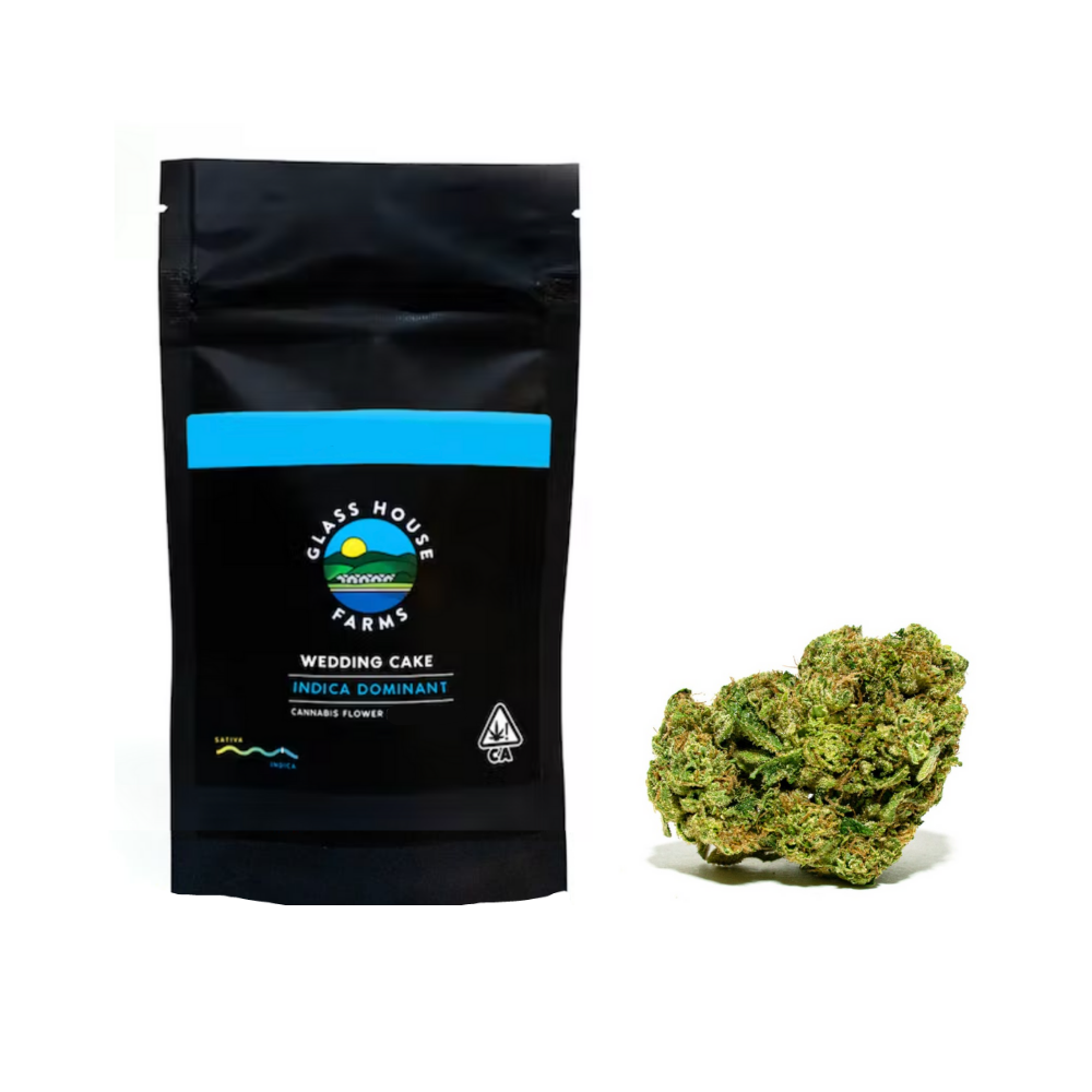 This mylar bag contains 28 grams of Wedding from Glass House. Wedding Cake is stoney Indica that's perfect for winding down on the couch or bed after a long day. Glass House Farms is a cannabis brand with expert cultivators that craft cannabis flower by hand, in state-of-the-art greenhouses, drenched in the SoCal sun. Each flower is trimmed and packaged with exceeding care to deliver a consistently premium craft and quality.