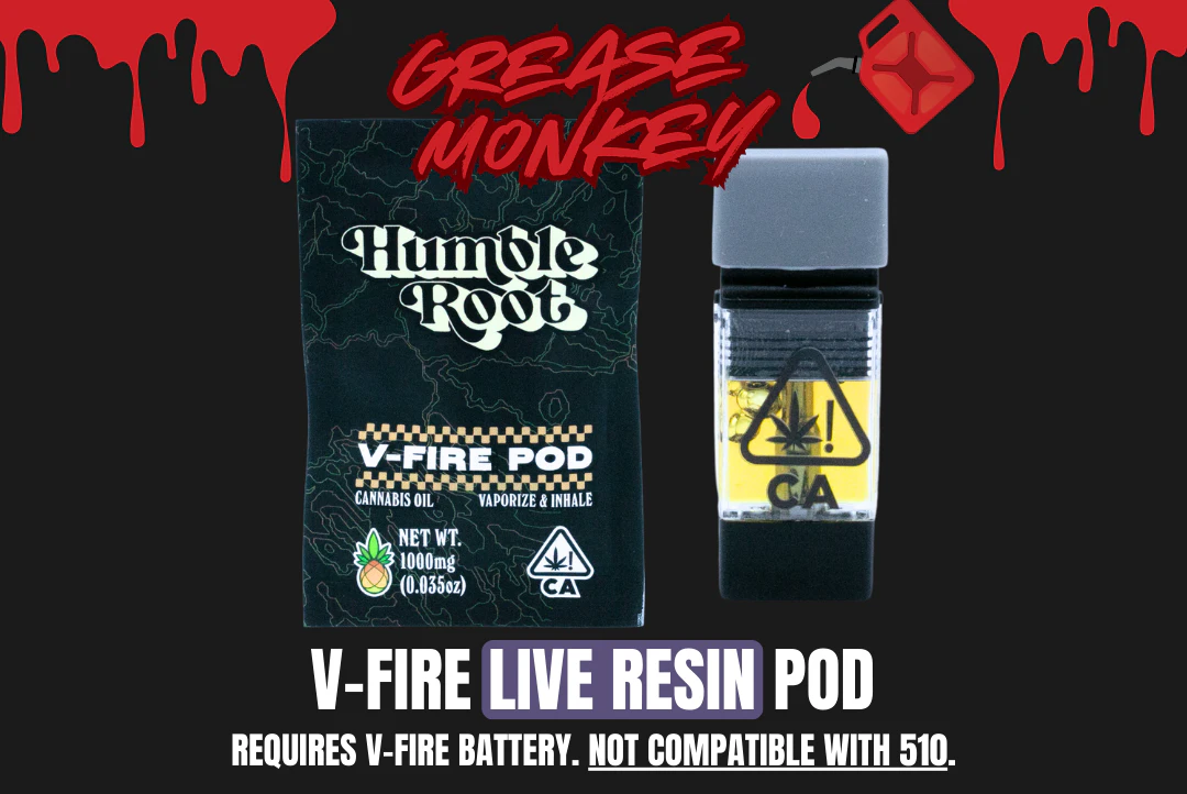Get your gears running again with this 1g Grease Monkey vFire Live Resin Pod crafted for high potency portable fun and made with true cannabis terpenes. Humble Root offers quality cannabis products to get you feeling just right under the influence of good vibes at a price tag you can smile about. Compatible with vFire batteries only that is not included.