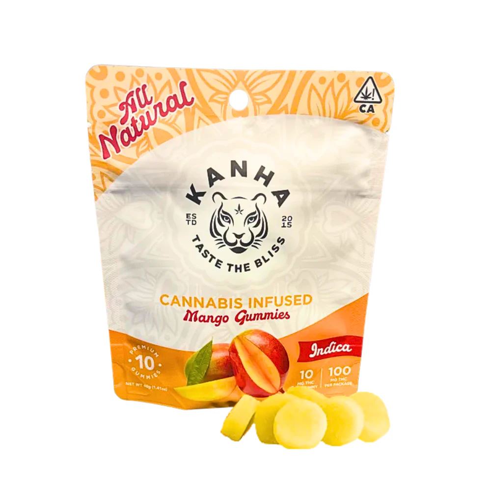 KANHA Mango Indica Gummies offer a sweet, calming experience, blending the natural flavors of mango with the relaxing properties of indica. Each gummy contains 10mg of THC, complemented by fruit-forward terpenes like linalool, providing a harmonious balance of flavor and tranquility.