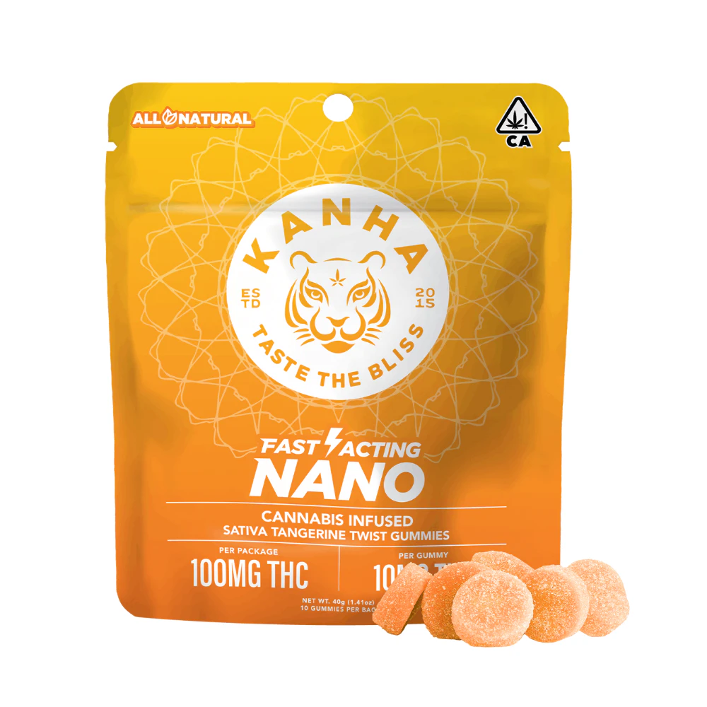 This package contains 100mg THC Kanha Nano Tangerine Twist gummies from Kanha Edibles. It has 100mg worth of cannabis-infused gummies inside that have 10mg in each, totaling 10 pieces. Kanha Nano utilizes nanomolecular technology to create the first fast-acting gummies in the industry. They take their award-winning, great-tasting gummies and infuse them with cannabinoid particles smaller than a wavelength of light, which increases the speed and amount that enters your bloodstream. These Tangerine gummies are juicy sweet and made with Sativa terpenes, which induce a stimulating and uplifting state of mind. Kanha has supercharged the nanotech in these gummies to be hard-hitting and send you into orbit in only 5-15 minutes on average.