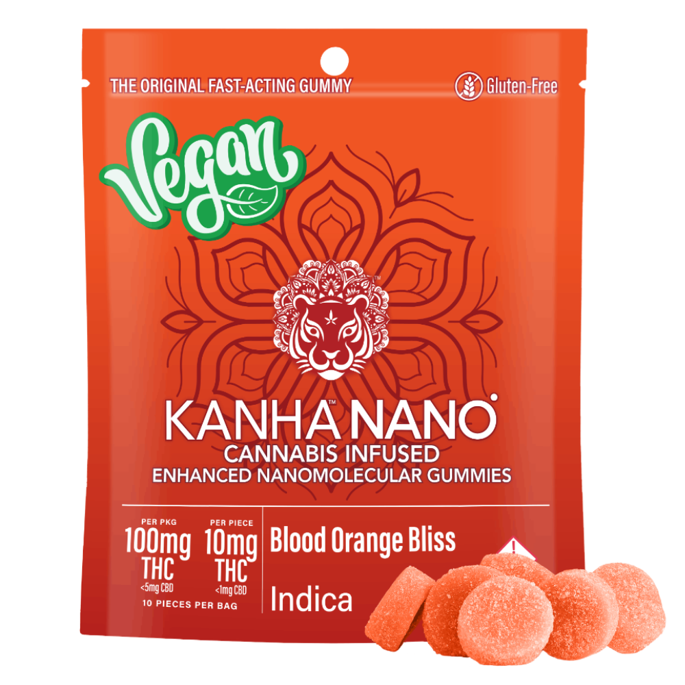 Kanha fast-acting gummies are now vegan! These 100mg THC Kanha Vegan Blood Orange Bliss Nano Gummies utilize nanomolecular technology with a vegan base to create delicious, fast-acting gummies that maintain Kanha's signature soft texture with a refreshing Blood Orange twist. With cannabinoid particles smaller than a wavelength of light, the body can absorb them quicker, meaning you can enjoy yourself even faster! So go ahead and take a joyful journey with the bright, rich flavor of Blood Oranges with Kanha Nano Vegan. 10mg THC per gummy, 10 gummies per bag.