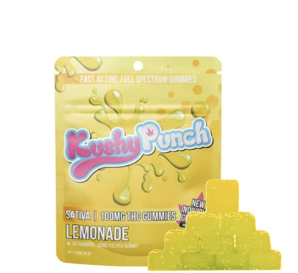 This package contains 100mg of THC Lemonade (Sativa) Gummies from Kushy Punch. Enjoy 10 pieces of individually wrapped lemon-flavored edibles made with full spectrum oil. A Sativa forward gummy that is perfect for recreational activities or an afternoon movie. As the packaging states, these edibles are fast-acting and pack that kush punch!