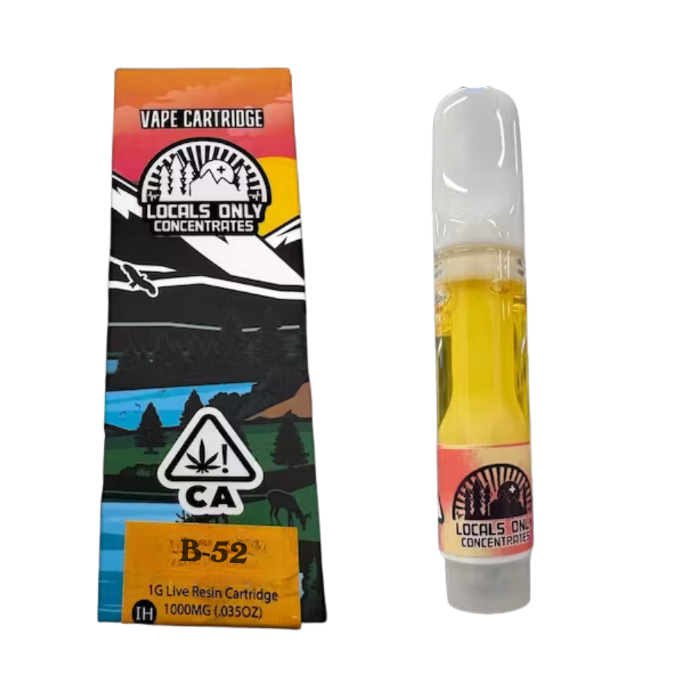 Catch a wavy vibe with this 1g vape cartridge from Locals Only featuring the strain B-52. Crossed from a mysterious Hybrid lineage, this Live Resin 510 thread porcelain cartridge will get the job done.