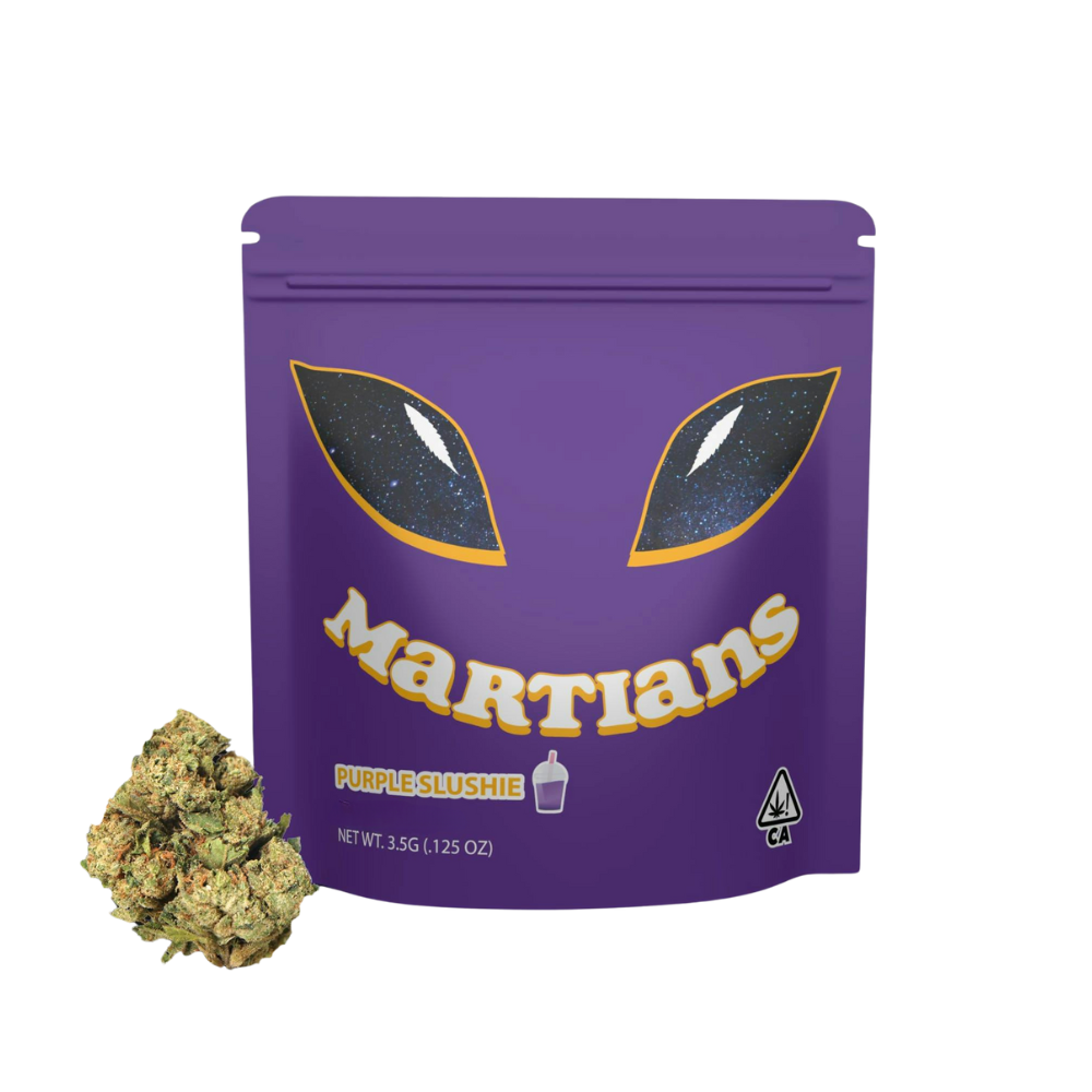 Take in the cosmic delight of Purple Slushie by Martians. This (Greenhouse) strain features a captivating blend of fruity, sweet, woody, hoppy, and herbaceous flavors. Known for its relaxing and potentially sedating effects, Purple Slushie may also offer pain relief. With a terpene profile high in myrcene, pinene, and caryophyllene, this out-of-this-world blend is perfect for those seeking extra relaxation and enjoyment.