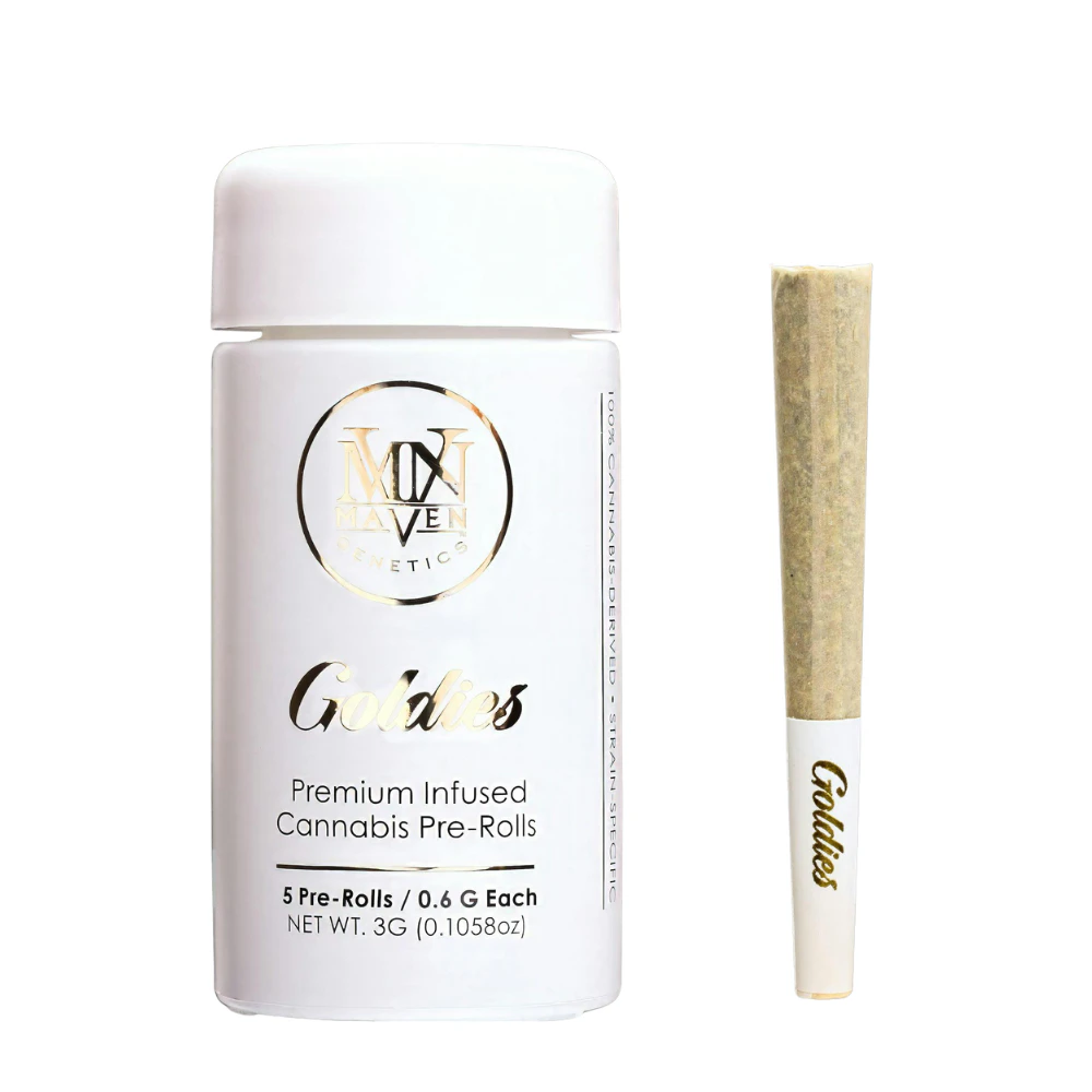 Goldies are Maven’s premium infused cannabis pre-rolls — crafted for connoisseurs who demand purity, potency, and authenticity. Each 5-pack contains five 0.6g joints made exclusively from their award-winning indoor flower, ultra-refined cannabis oil, and strain-specific kief.