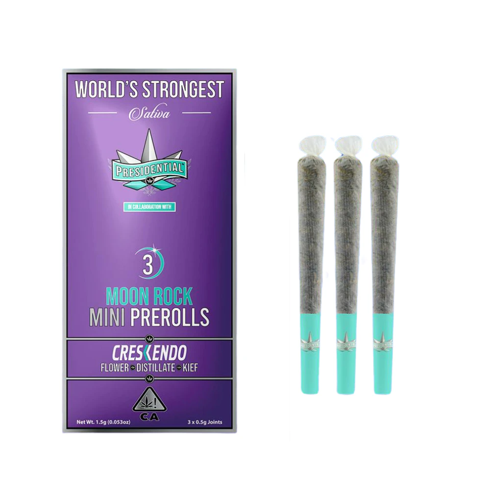 Experience Presidential's Moon Rock-infused joints for an enjoyable summer weekend. This is a 3-pack of 2.1g Crescendo Moonrock pre-rolls, weighing 0.7 grams each, combines top-shelf flower, premium kief, and THC distillate blend. Carefully rolled with a chlorine-free filter, these high-quality joints never compromise on distillate and kief. Perfect for those with a high tolerance or seeking a good time, let these joints transport you to the moon and back.