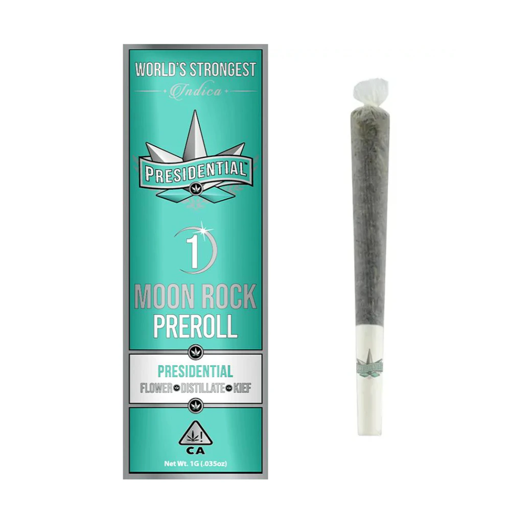 With this 1g Classic Moonrock Pre-Roll, Presidential brings you top-shelf organic flower infused with Premium THC Distillate and the highest quality kief. Rolled in all-natural unbleached hemp paper, stuffed with the best top-shelf flower, and fitted with a chlorine-free filter to allow for only the smoothest of hits, Presidential’s Moon Rock infused pre-rolls are the only thing you need to elevate your weekend. Recommended for those with a high tolerance or those looking for a good time, these Presidential pre-rolls are sure to send you to the moon and back.