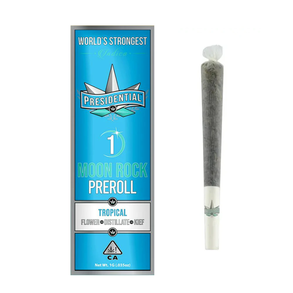 This 1g Tropical Presidential Moon Rock pre-roll by Presidential THC consists of indoor craft cannabis and features island fruit flavors. The cannabis is then INFUSED with premium Liquid Live Resin, using Presidential’s proprietary infusion process that enables us to permeate the flower to the stem. Finally, it is coated in the highest quality Diamonds, creating the slowest burning, most potent Moon Rocks on the market!