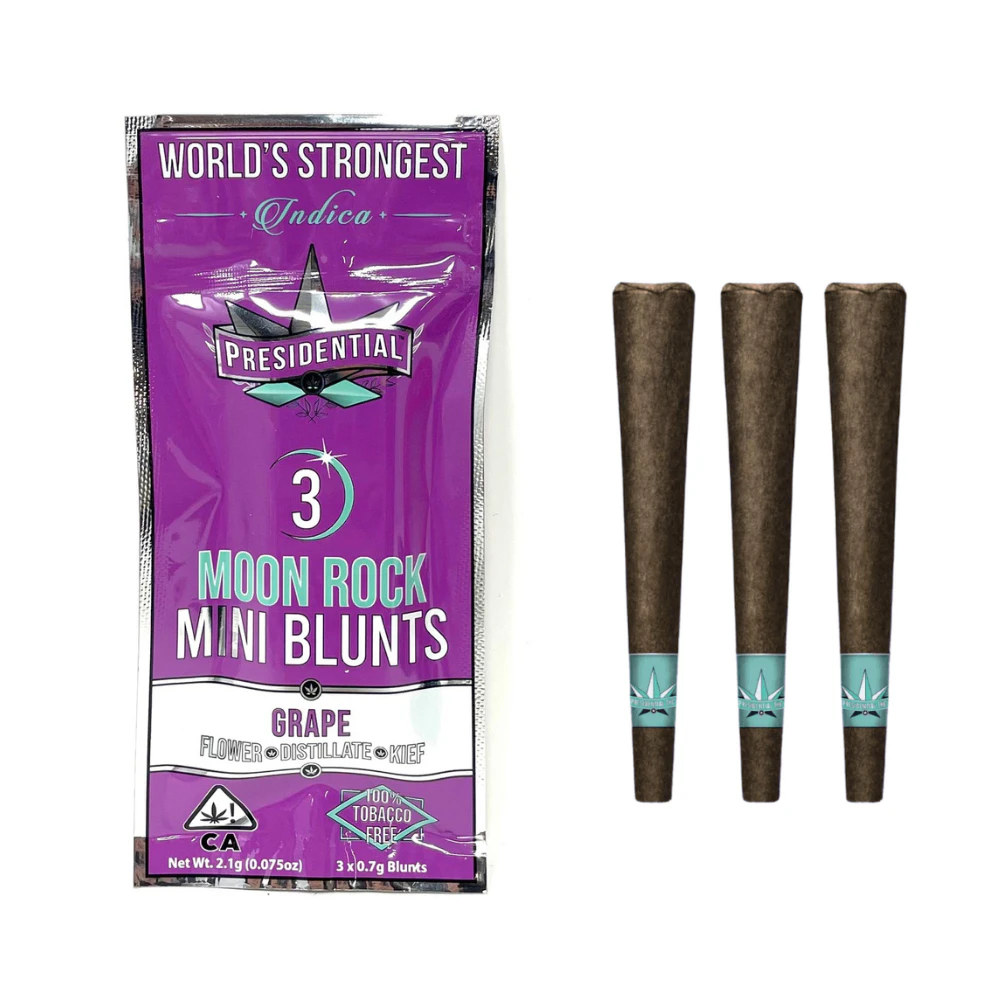 Pre-rolls in this 3-pack of 1.5g Grape flavored Moonrock Infused joints weigh .5 grams apiece. Presidential provides you with top-shelf flower, premium kief, and THC distillate with a peachy mango blend flavor. You only need Presidential's Moon Rock-infused joints to make your summer weekend enjoyable. To provide the smoothest possible hits, they are carefully rolled, filled with the finest top-shelf flower, and furnished with a chlorine-free filter. These high-end joints are NEVER rolled, sprayed, or dipped and ALWAYS contain quality distillate and kief. These Presidential pre-rolls are recommended for those who have a high tolerance or are looking for a good time since they will transport you to the moon and back.