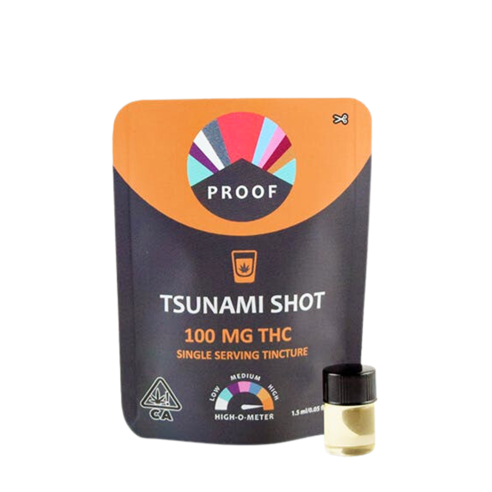 Experience the exhilaration of Proof's latest creation, the Tsunami Shot! Enclosed within a petite bottle, this single-serving tincture unleashes a monumental 100mg encounter. Prepare for a remarkable journey that awaits within this compact container. Seamlessly stow-and-go, allowing yourself to make a resounding impact throughout your day. Be forewarned, as this tincture yields a truly potent psychoactive effect, catering exclusively to the seasoned cannabis connoisseur. It's essential to emphasize that our Tsunami Shot upholds various dietary preferences, boasting its vegan, gluten-free, sugar-free, and cruelty-free composition. The formulation combines the goodness of medium-chain triglyceride (MCT) coconut oil with the infusion of cannabis oil, ensuring an exceptional experience with each sip.