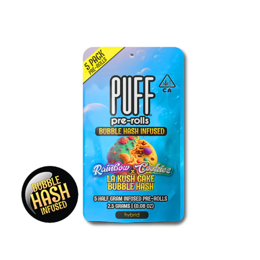 Get toasted with this 2.5g Bubble Hash infused Pre-roll (.5g x 5 pack) from PUFF. Rolled with Premium Rainbow Cookies Flower and LA Kush Cake Bubble Hash. Rainbow Cookies crossed with LA Kush Cake. This unique fusion blends the sweet and fruity notes of Rainbow Cookies with the earthy and decadent flavors of LA Kush Cake. The result is a harmonious symphony of tastes that tantalizes the taste buds. Contains 5 pre-rolls, .5g each. 2.5 grams per package.