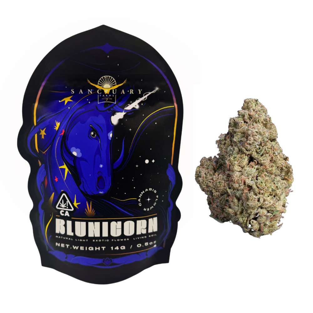 Ride the rainbow with this cannabis resealable mylar bag from Sanctuary Farms containing 14 grams of the Hybrid strain Blunicorn. The greenhouse grown strain comes with a complex terpene profile that tastes like pungent cheese with a blueberry hint on the exhale.