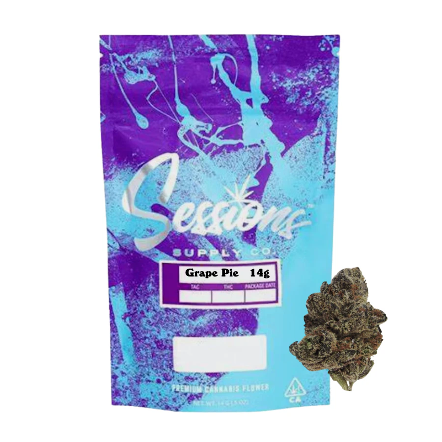 This mylar bag contains 14 grams of the cannabis strain Grape Pie from Sessions. Grape Pie has the appearance of an old-school Indica purp strain, with terpy trichomes that provide delicious sour and sugary grape aromas.