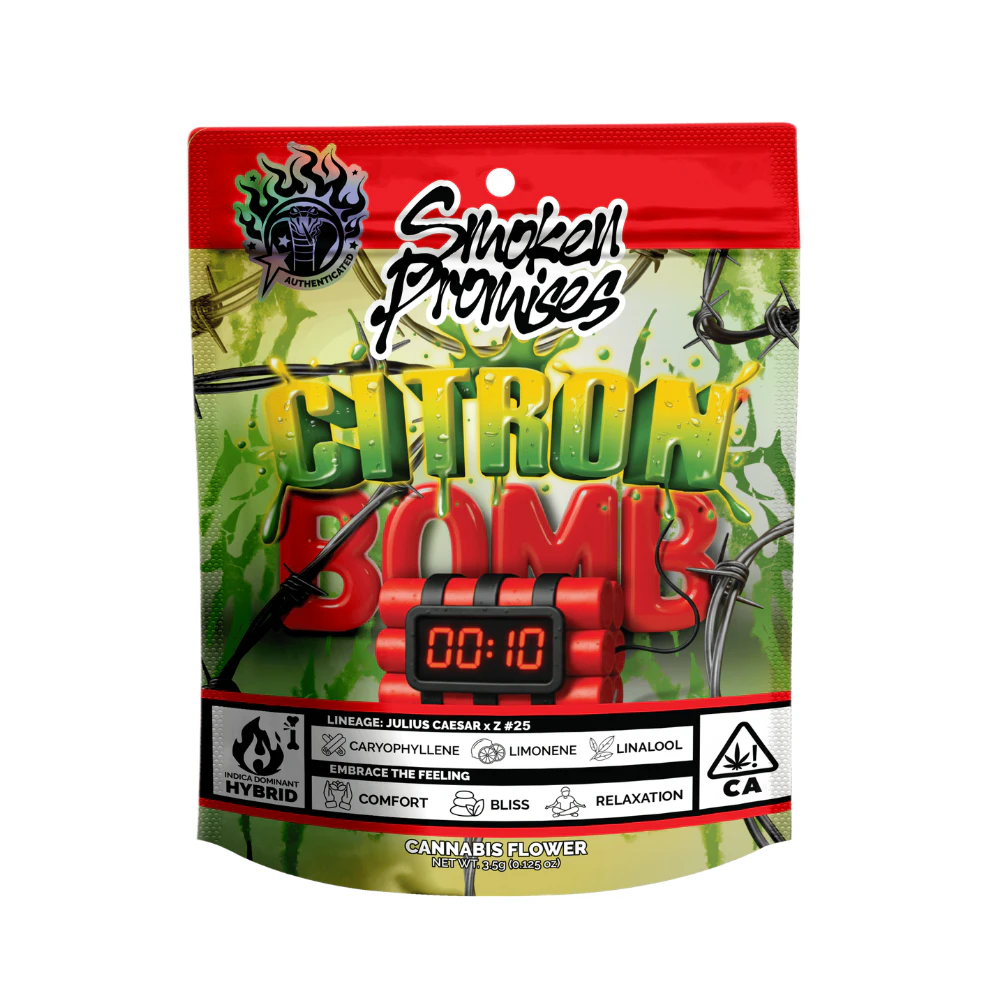 Escape the chaos and detonate your stress with Citron Bomb, an indica-dominant hybrid built for bliss. Born to extinguish tension, this potent strain wraps your body and mind in a comforting embrace, offering relief from anxiety and stress. Let the explosive burst of bright, tangy citrus flavors ignite your senses before the deep, soothing effects take hold. Citron Bomb doesn't just relax you, it provides a gentle, heavy serenity that assures peace and happiness are within reach.