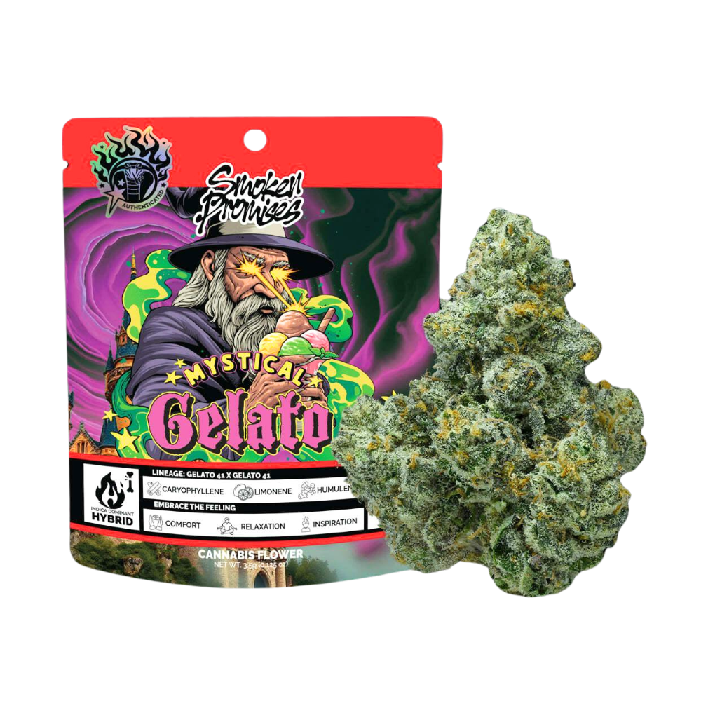 Mystical Gelato is an indica-heavy hybrid that offers relaxation and creativity. It boasts dark purple buds and a rich, velvety smooth flavor profile with creamy notes and a hint of mystical spice. It aims to transport senses to a realm of serene wonder, where stress and worry vanish. This resealable mylar bag contains 3.5 grams (between 6-9 nugs) of hand-trimmed by Smokin Promises.
