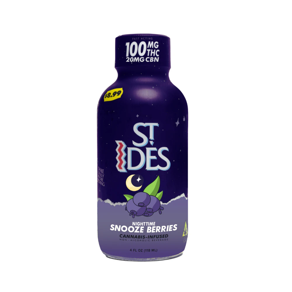 Snooze Berry is a compact 4oz shot, perfect for evening use, delivering 100mg of THC blended with 20mg of CBN. Infused with juicy berry flavor and real juice concentrate, this potent drink is crafted to help you chill, decompress, and drift into a restful slumber. Shake well before use. Start with 1 serving (0.4 oz or 10mg THC + 2mg CBN). Wait at least 60–90 minutes to gauge effects before considering more. Best served chilled. Refrigerate after opening.