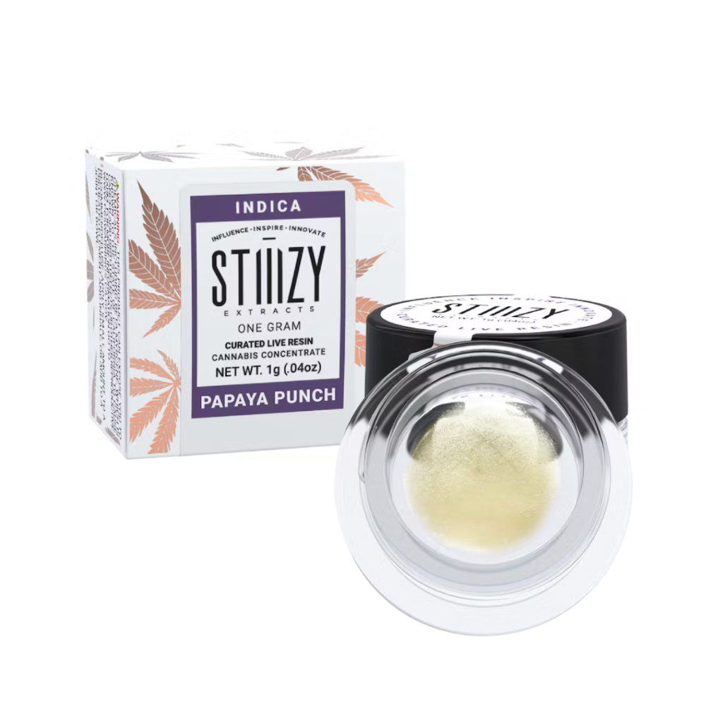 This concentrate jar contains 1 gram of Papaya Punch Curated Live Resin from Stiiizy. Stiiizy's Curated Live Resin extracts the true essence of the plant. The entire plant is harvested and flash-frozen, preserving the full spectrum of cannabinoids and flavor. Always innovating, always inspiring, always influencing: that's STIIIZY. They want to take it to new heights.