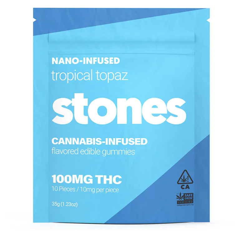 Topaz gems are typically found in deep veins and cavities of molten granite, topaz are formed when aluminum, silicon, and oxygen are forged together and exposed to fluorine-bearing vapors that are given off as the surrounding rock crystallizes. Stones' Topaz gummies are infused with premium THC and a sweet tropical flavor that will make your mouth water. The allure of colored gemstones is different for everyone, but the allure of Stones THC infused gummies cannot be denied. 10mg per gummy, 10 gummies per pack = 100mg.
