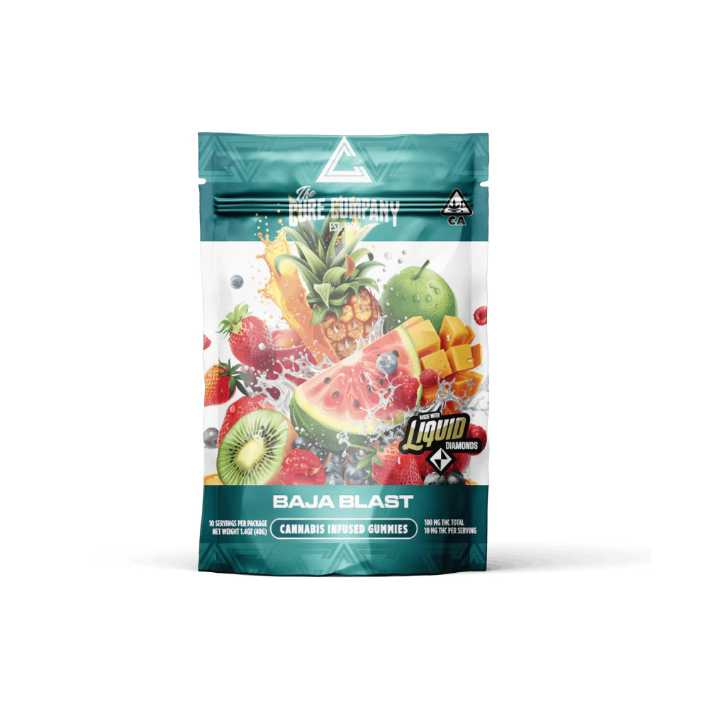 Inspired by the iconic citrus-tropical soda, The Cure Company’s Baja Blast gummies unleash a refreshing waterfall of lime, pineapple, and cool blue raspberry flavors onto your palate. Crafted with full-spectrum liquid diamonds live resin and grown from LA’s finest single-source flower, each gummy may hit with incredibly crisp flavor and an eye-widening clarity. Every bag includes 10 vegan gummies at 10mg THC each—dose up for potentially perfect for a wave of flavorful elevation.