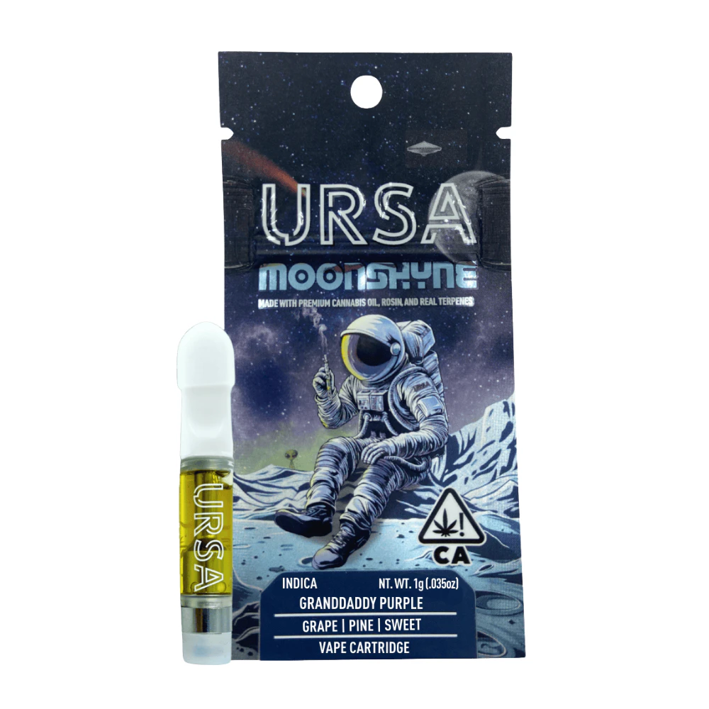Compatible with 510 thread batteries sold separately! Introducing Moonshyne, the latest cartridge from URSA Extracts. This premium cannabis oil cartridge is crafted for those who crave the intensity of our live products. Infused with fresh-frozen high terpene extracts and Solventless Live Rosin, Moonshyne delivers a smooth yet potent high. Propel into a cosmic high where every puff is a voyage!