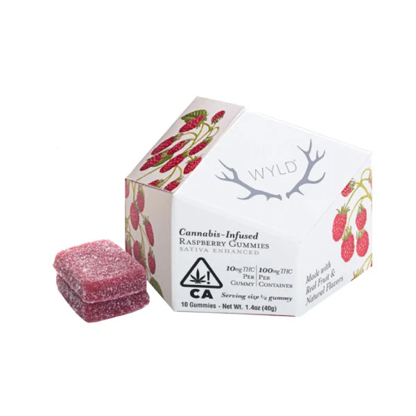 WYLD's 100mg Raspberry Sativa Enhanced gummies are made with real fruit and are enhanced with fruit terpenes that will assist in creating euphoric and energizing experiences. Ideal for keeping you focused on the task at hand, refining your creative endeavors, or even better, getting you out on your next expedition! Ingredients: Tapioca Syrup, Sugar, Water (H20), Raspberry Juice Concentrate, Gelatin, Natural Flavoring, Coconut Oil, Citric Acid, Cannabis Extract, Sunflower Lecithin. Contains: Coconut. 10mg THC per gummy, 10 gummies per package = 100mg THC per package.