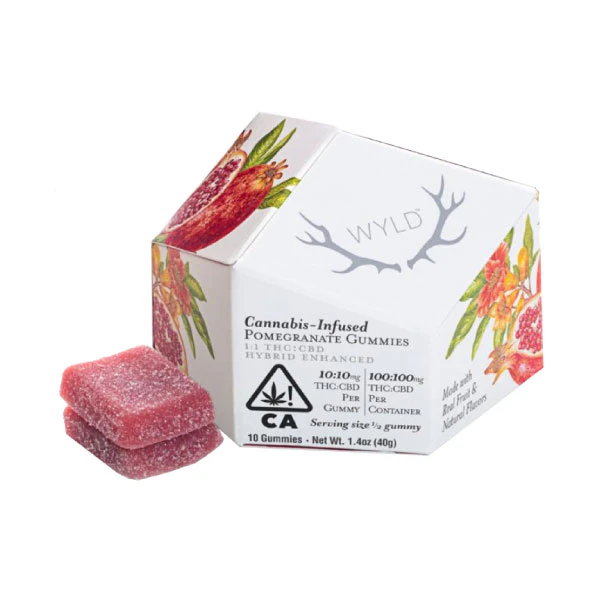 With 100mg Pomegranate 1:1 THC:CBD Hybrid Enhanced Gummies, WYLD has taken the best of both worlds. Containing both 100mg of CBD and 100mg of THC, they are a great compliment to any adventure by providing a balanced and enjoyable high for both mind and body. If you are new or sensitive to edibles, the Pomegranate gummies are an excellent place to start. Have some before getting into your yoga routine, or climbing to the highest peak. Wherever your expeditions may take you, our Pomegranate gummies make for a perfect companion. Ingredients: Tapioca Syrup, Sugar, Water (H20), Pomegranate Juice Concentrate, Gelatin, Natural Flavoring, Coconut Oil, Citric Acid, Cannabis Extract, Sunflower Lecithin. Contains: Coconut. 10mg THC and 10mg CBD per gummy, 10 gummies per package.