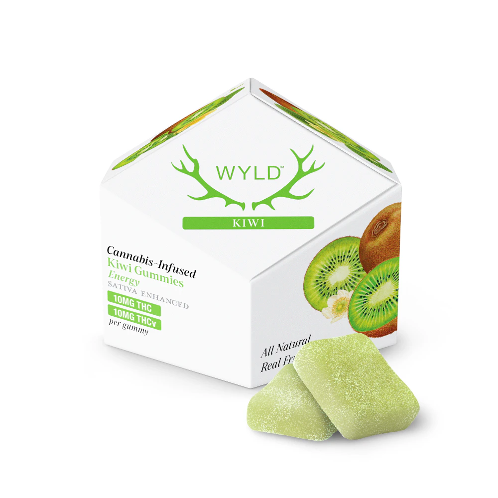 WYLD 200mg THC:THCv Kiwi gummies are tailor-made with real fruit and THCv to unlock your next level. With a 1 to 1 blend of THC and THCv, these uplifting gummies open up a Sativa experience that brings a boost of energy and focus to the typical THC high. Feeling Fuzzy? Time for Wyldโs Kiwi gummies.